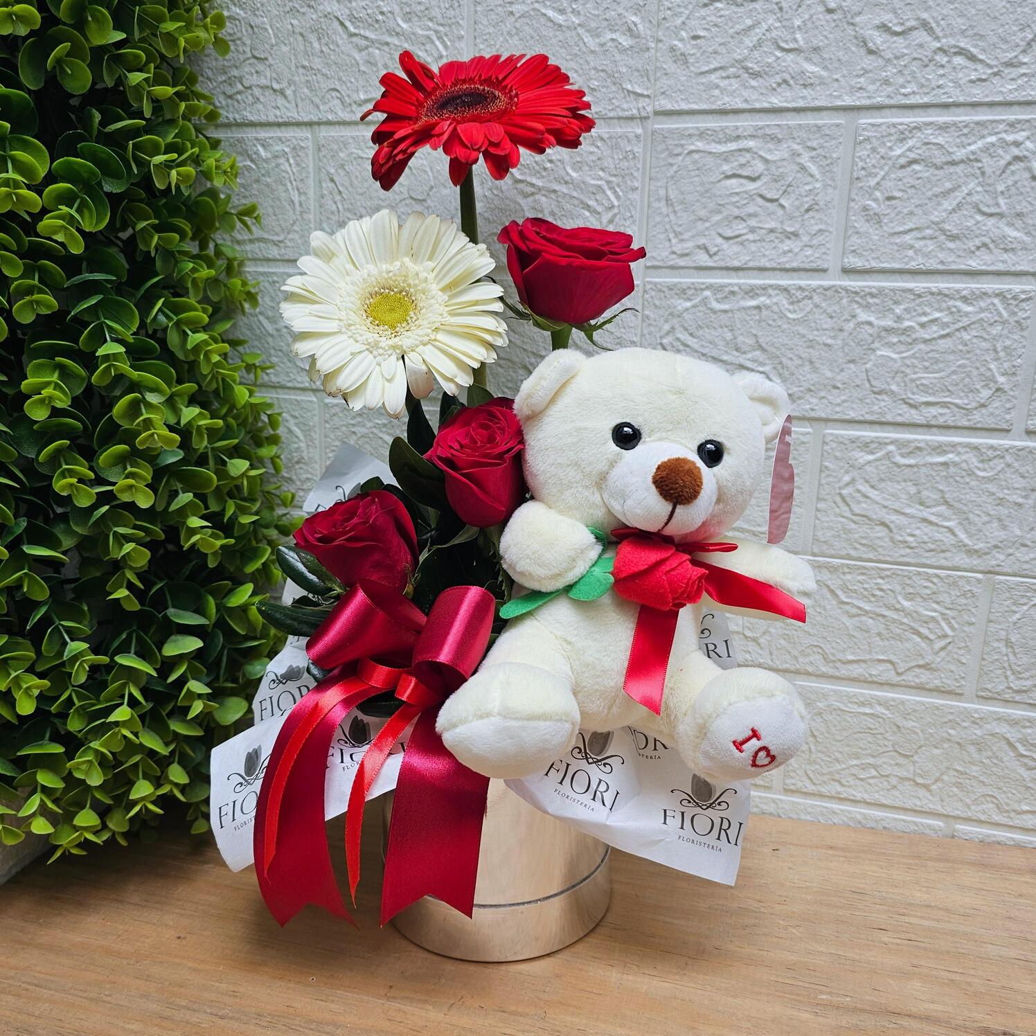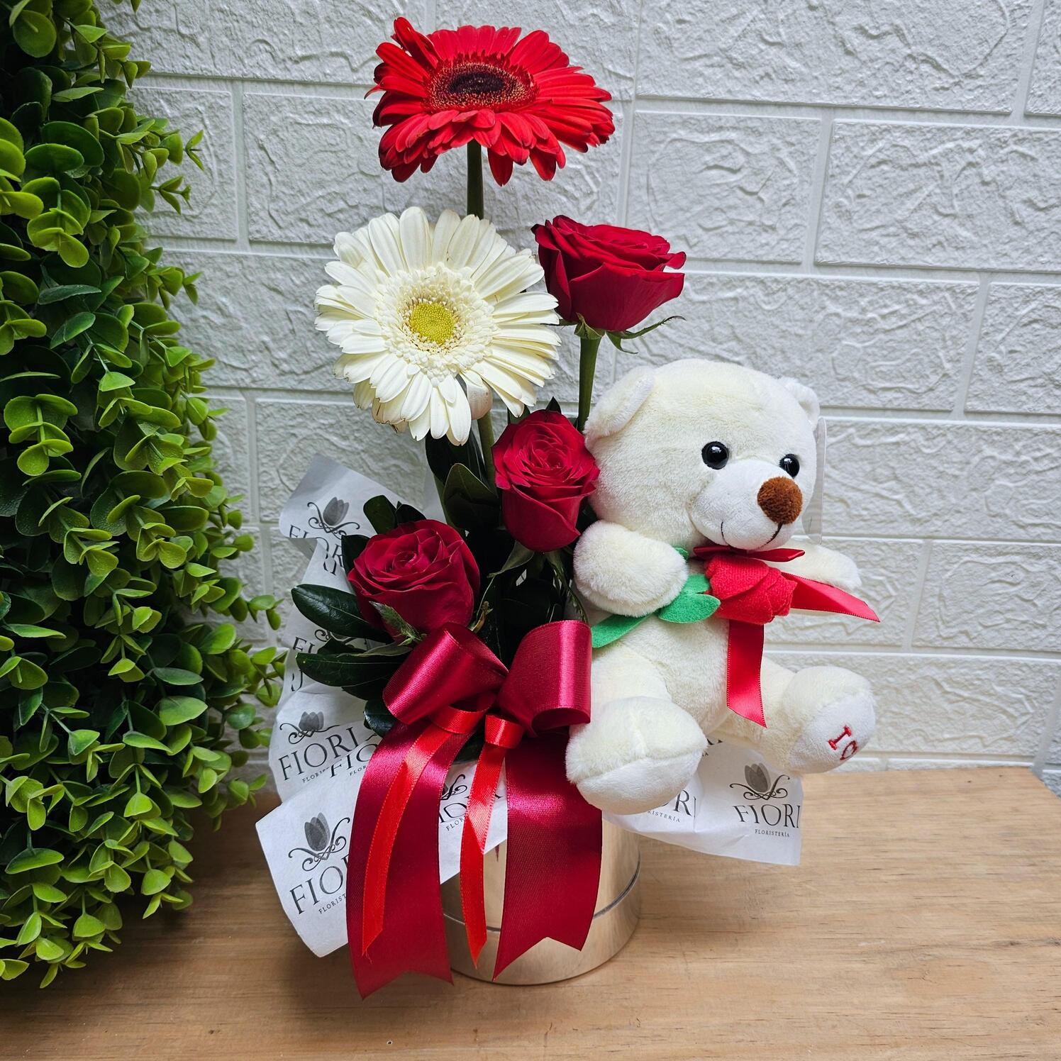 Porque el amor está en los detalles. Este arreglo floral destaca por su frescura y combinación natural de flores, acompañadas por un tierno osito de peluche, perfecto para regalar en San Valentín.