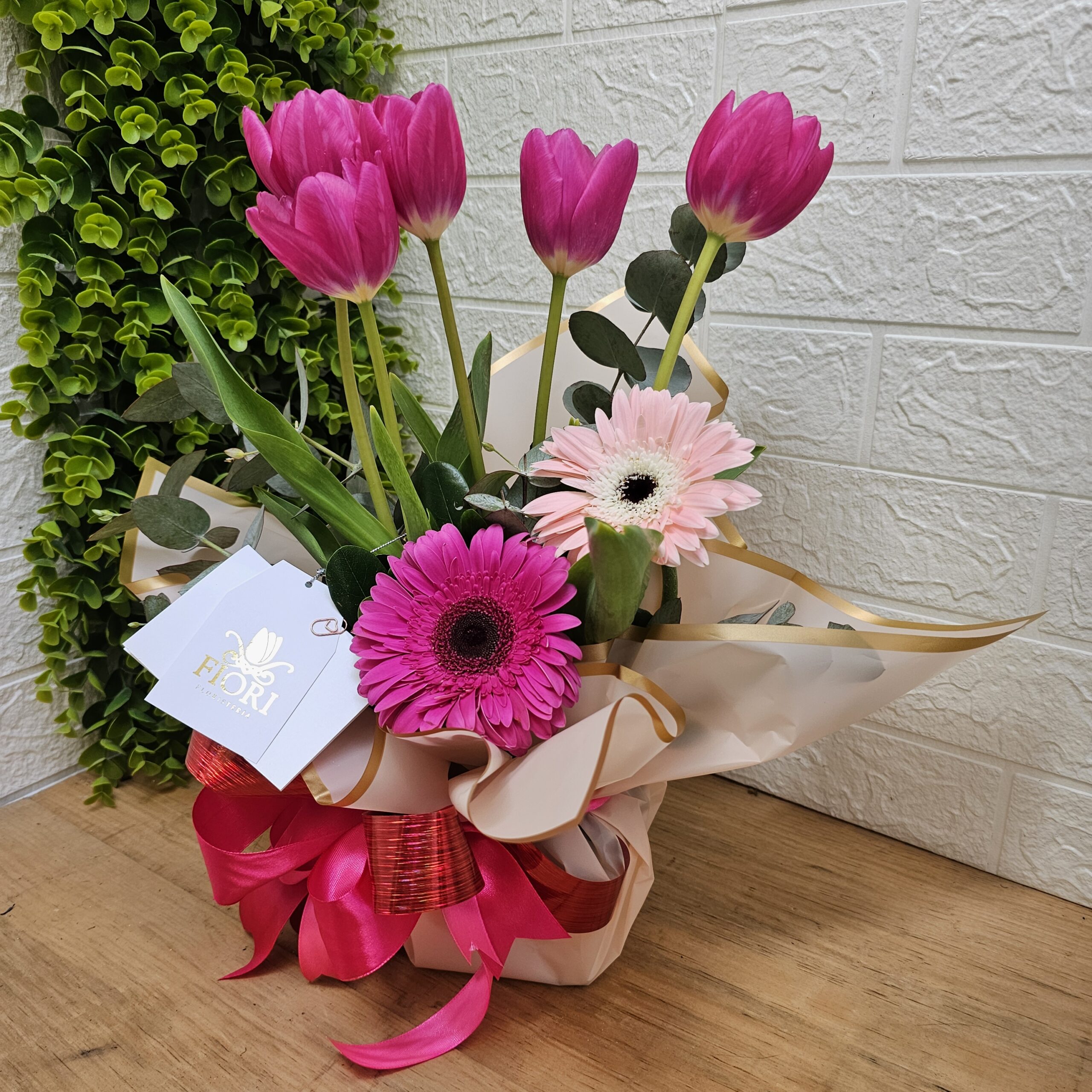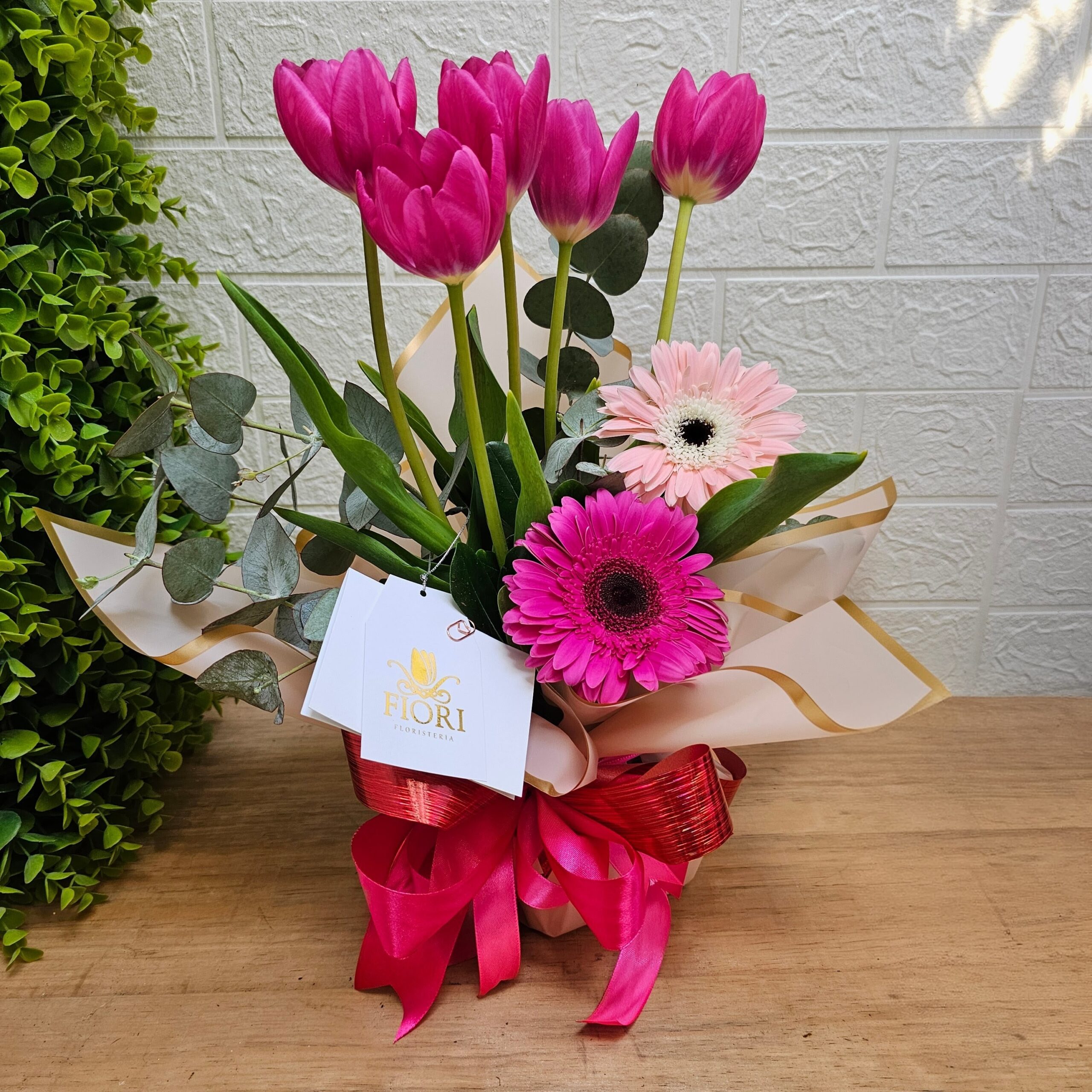 Encantador arreglo con 5 Finos Tulipanes, acompañados con la alegría de las Gerberas, la combinación perfecta, como Tu y Yo…