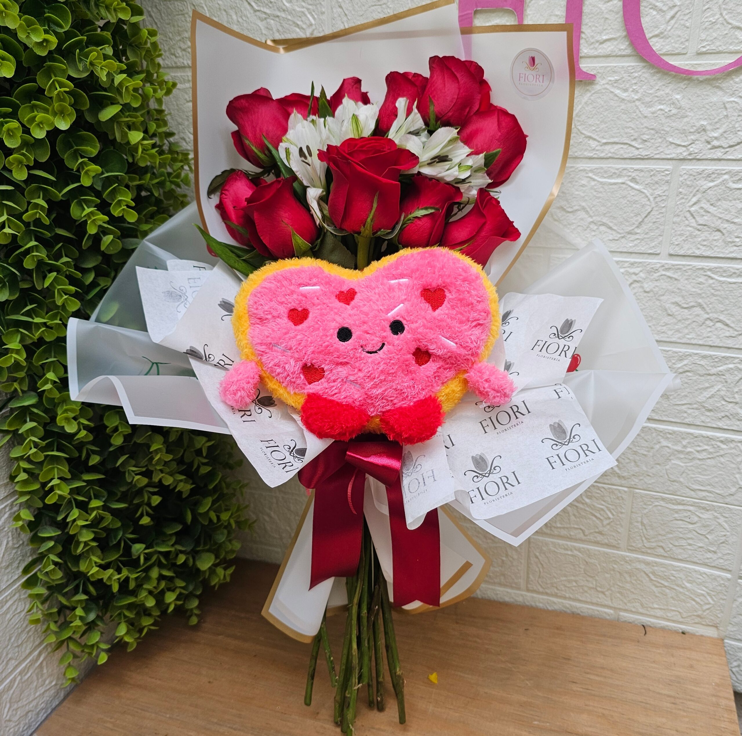 Un bouquet lleno de encanto que reúne 12 rosas, alstroemerias frescas y un peluche en forma de corazón, ideal para regalar ternura, amor y momentos inolvidables. Medida del peluche de Corazón 15cm.