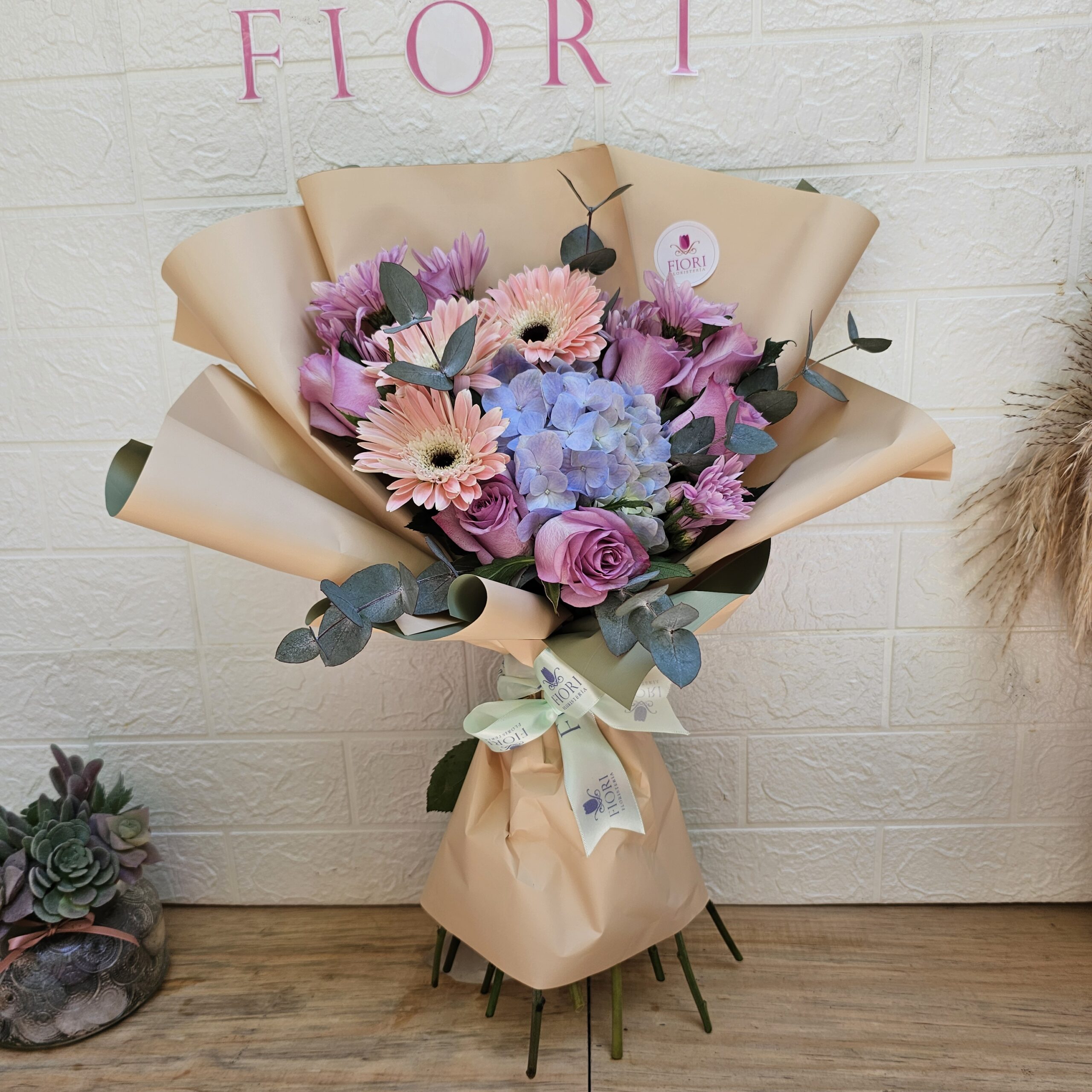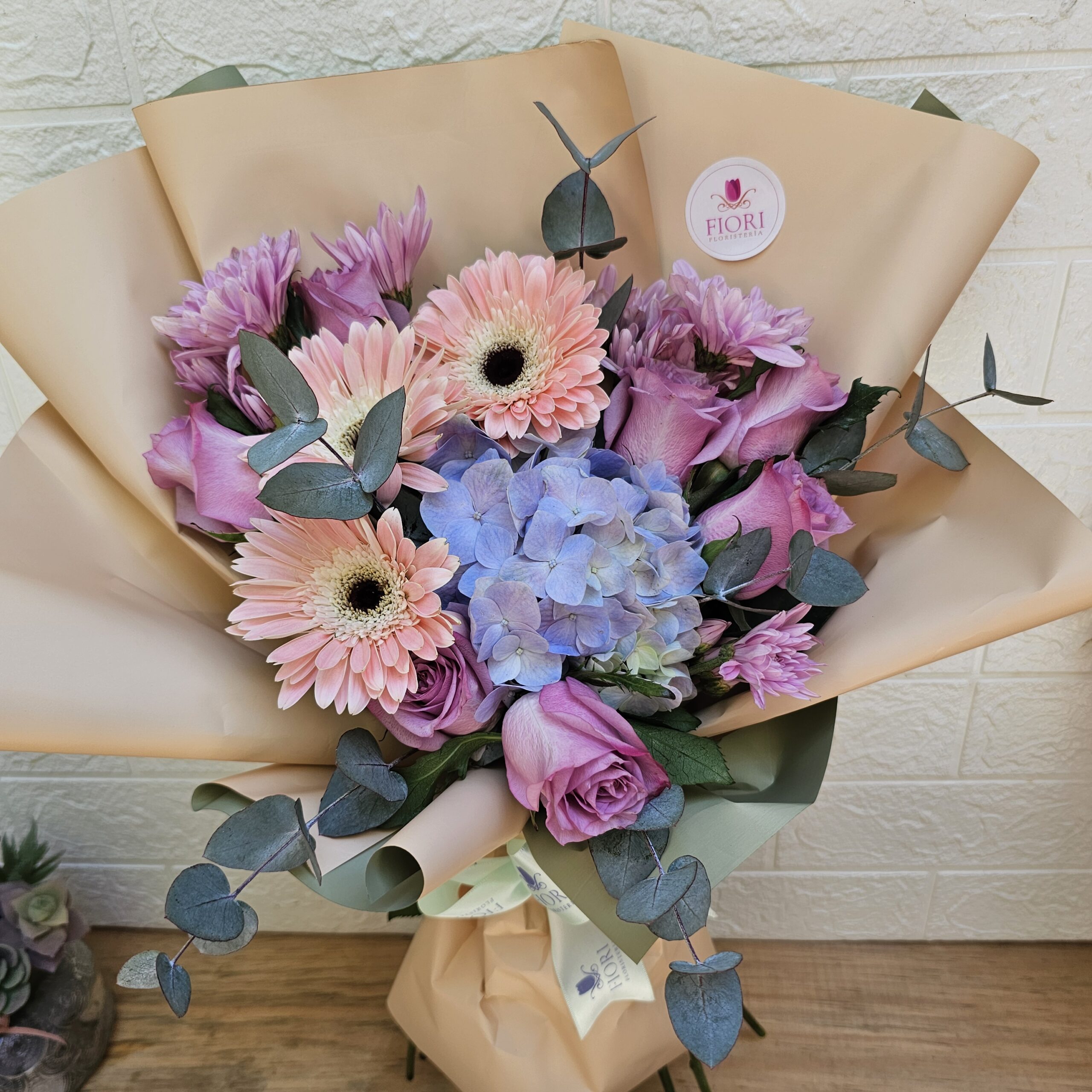 Elaborado con 7 Rosas lilas, 3 Gerberas en tono rosa durazno, Hortensia azul, Crisantemos y Toques de follaje fresco, con envoltura en papel premium y moño decorativo que le da un toque elegante y moderno.
