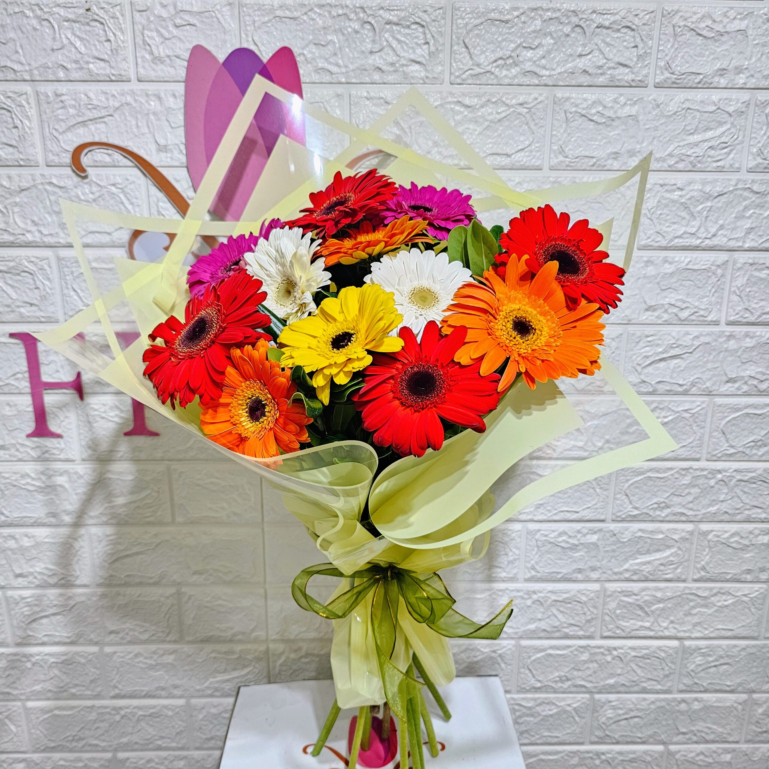 Diseñado con 12 Gerberas frescas de colores surtidos, Envoltura elegante y lazo decorativo. Listo para regalar!