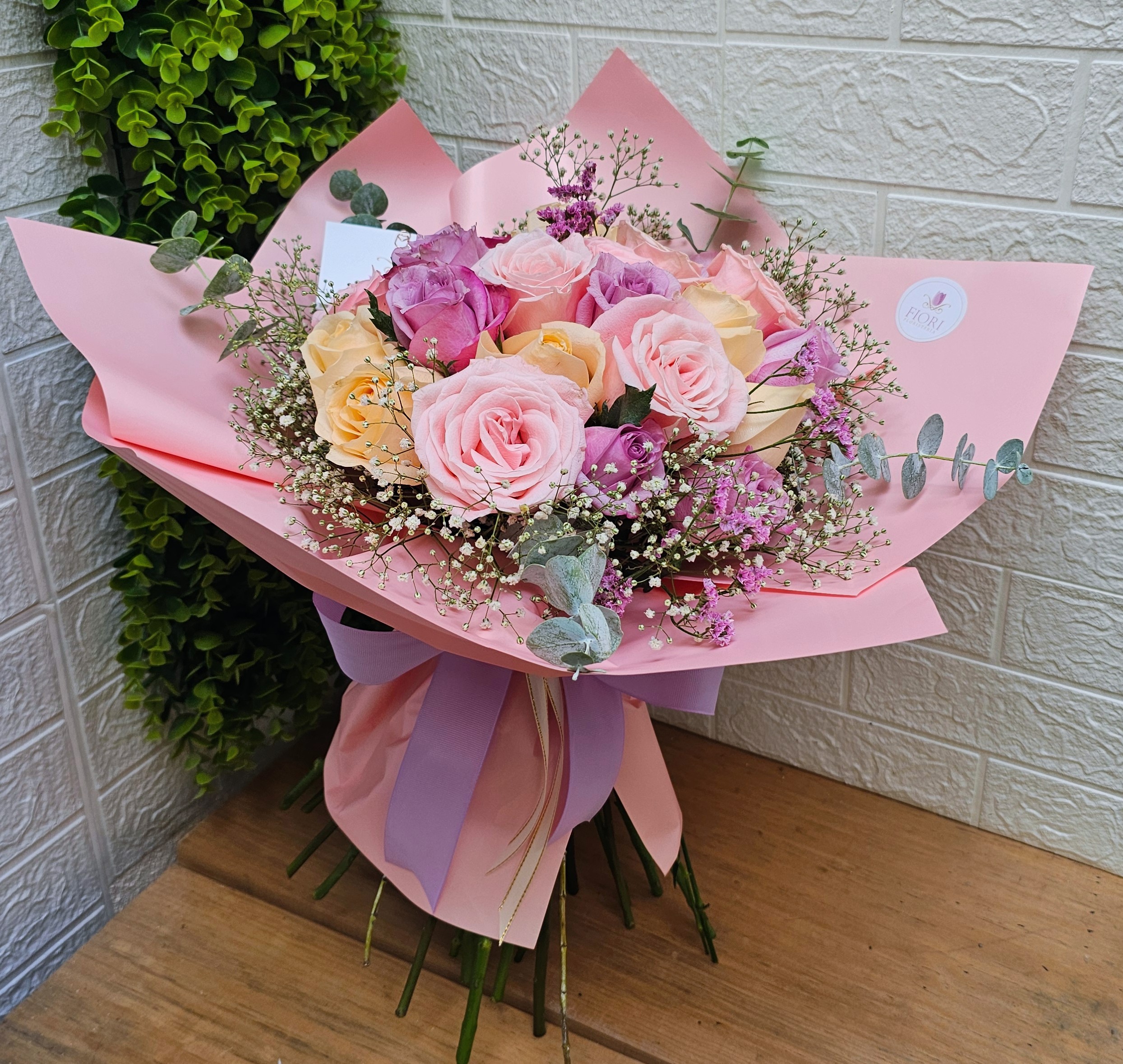 Un bouquet encantador de 24 rosas en tonos pasteles, cuidadosamente seleccionadas para transmitir suavidad y dulzura, envueltas en papel rosado premium, que realza la delicadeza de los colores y aporta un acabado elegante.