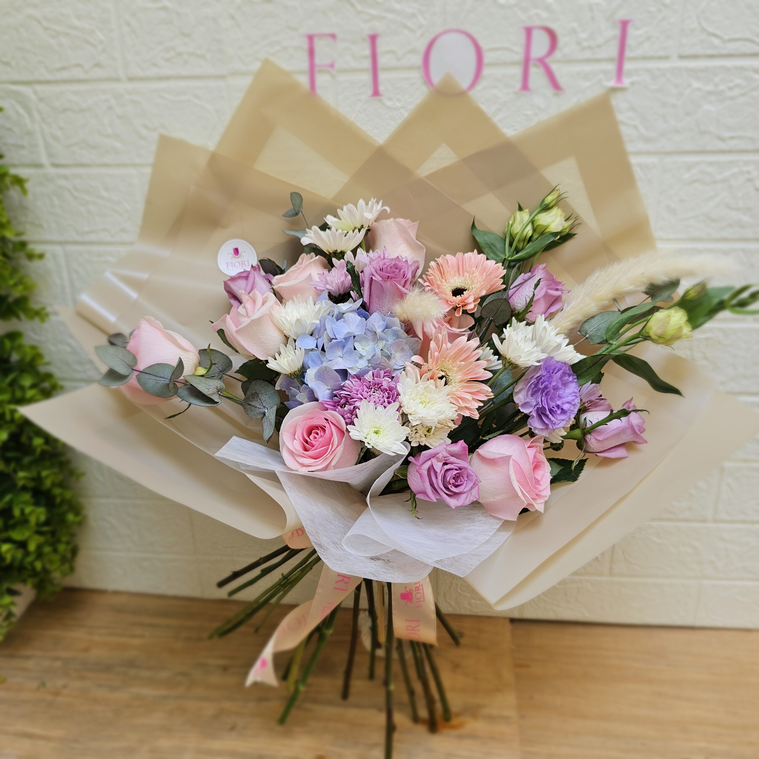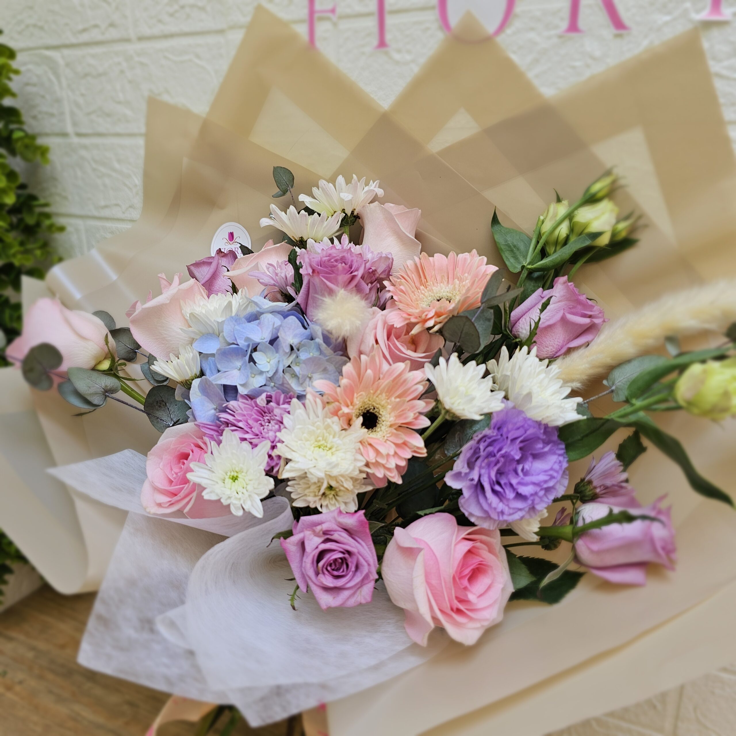 Diseñado con una delicada combinación de: Rosas rosa y lavanda, Hortensia azul, Gerberas, crisantemos, Lisianthus y follaje fresco.