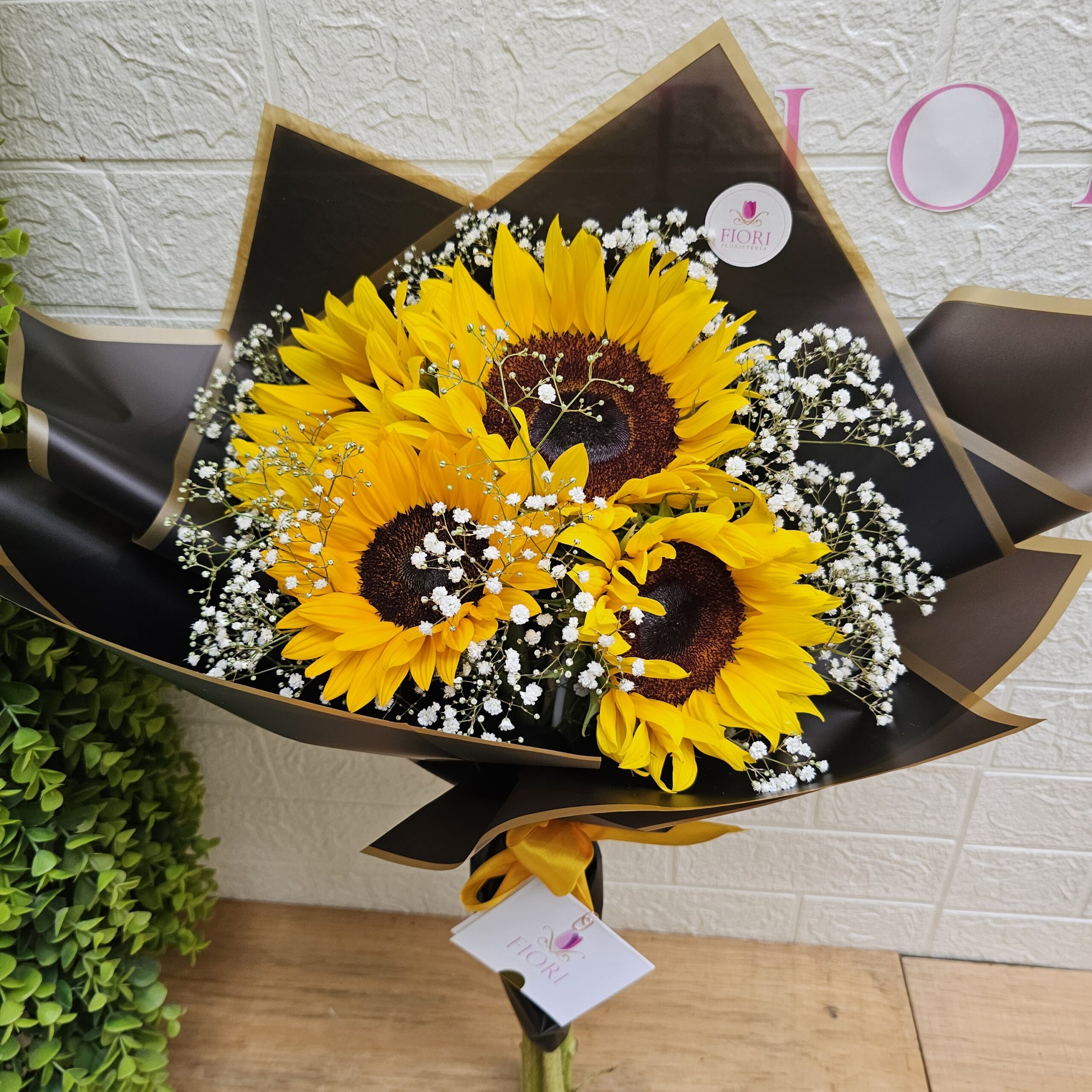 Un bouquet radiante con cuatro girasoles, símbolo de alegría y energía positiva. Acompañados de follaje gipso, este arreglo irradia luz y optimismo, perfecto para celebrar la amistad, enviar buenos deseos o iluminar cualquier día con su encanto.