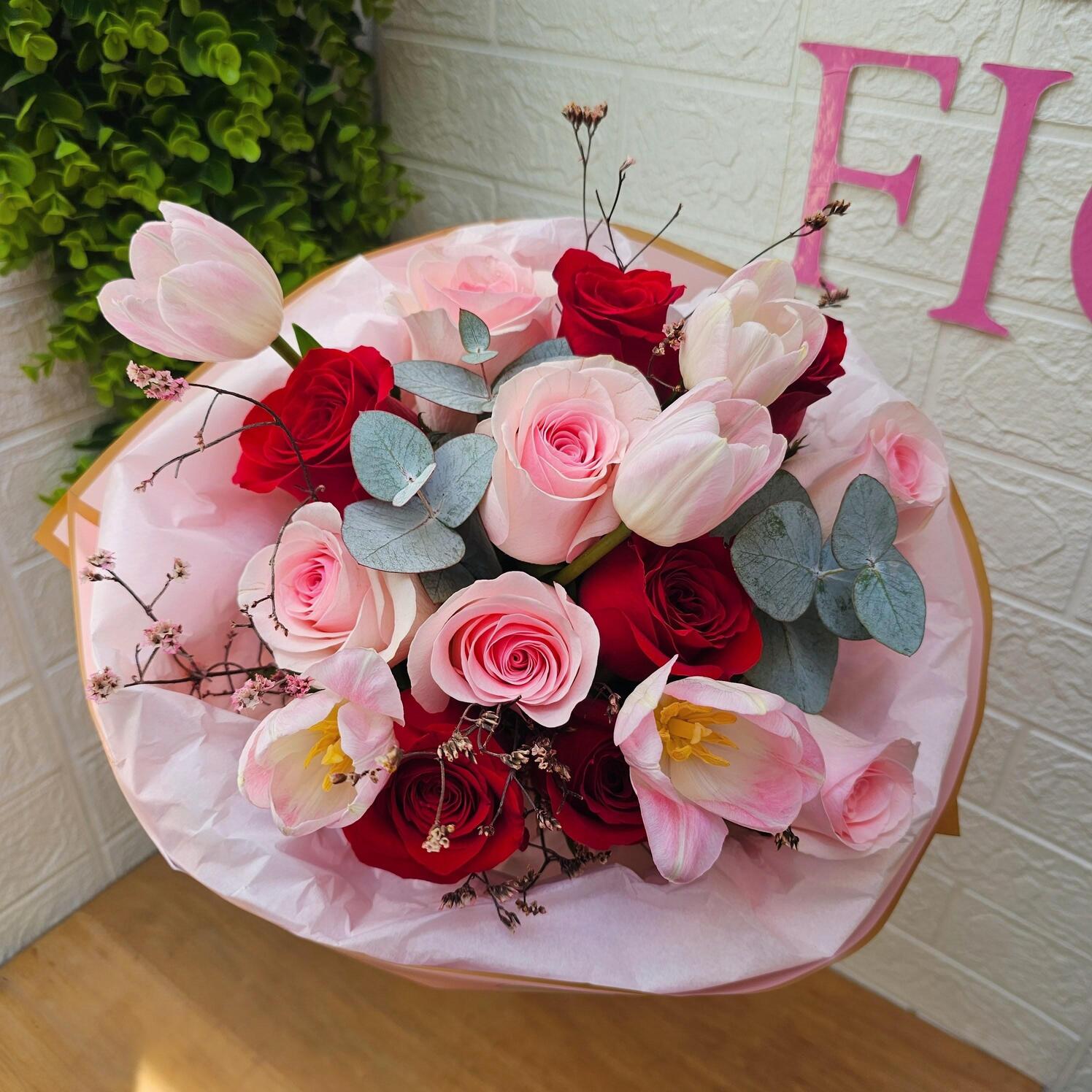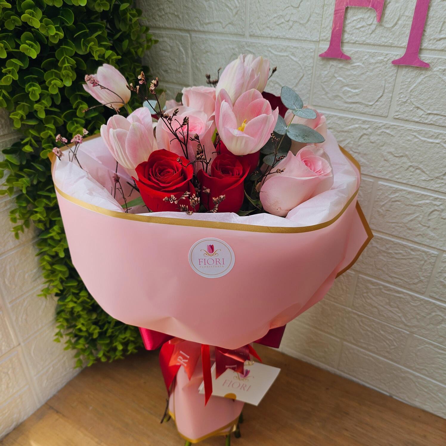 Un bouquet diseñado para emocionar. La combinación de 12 rosas y 5 tulipanes en tonos románticos, envueltos en una presentación elegante y suave, hace de este arreglo una pieza única que transmite amor, elegancia y buen gusto.