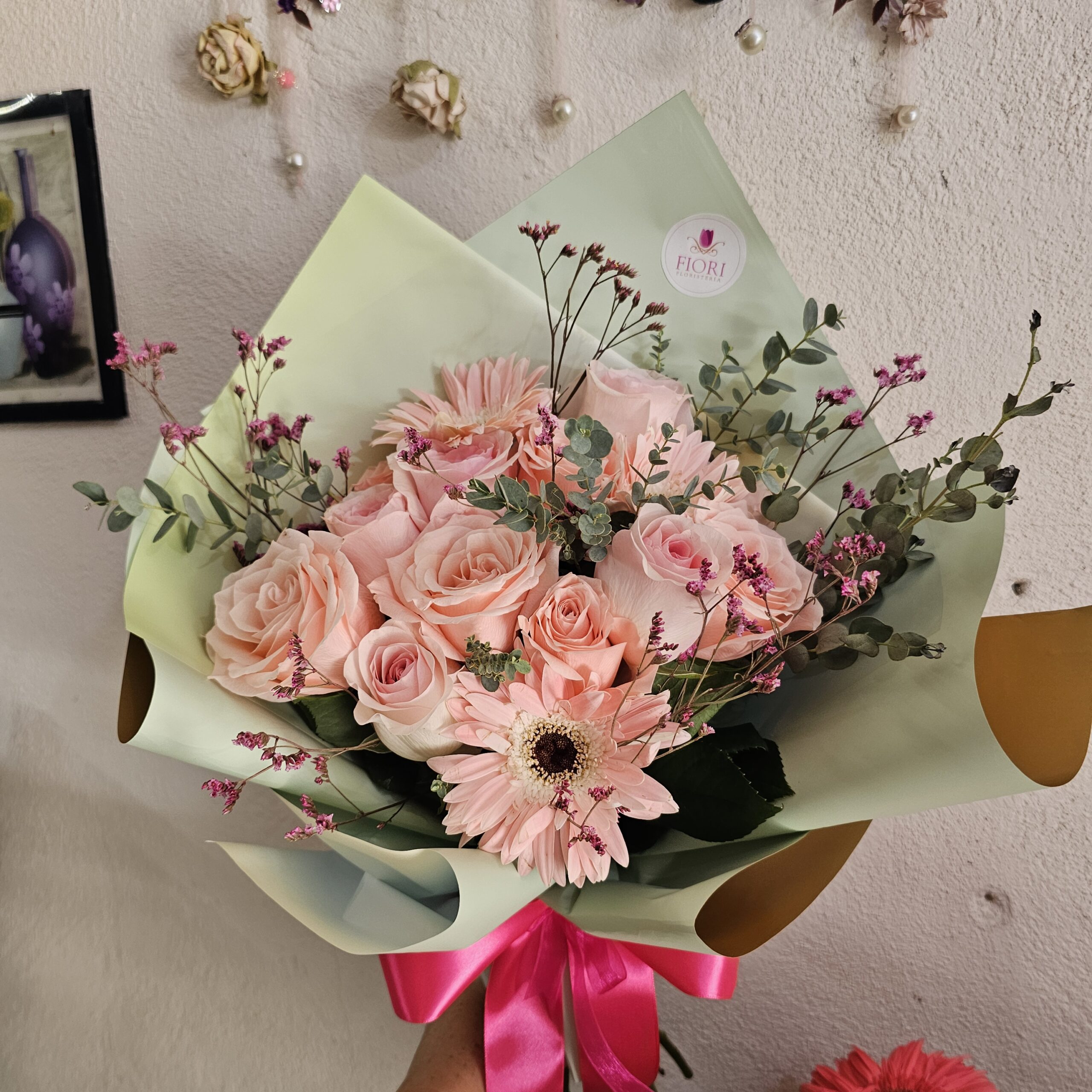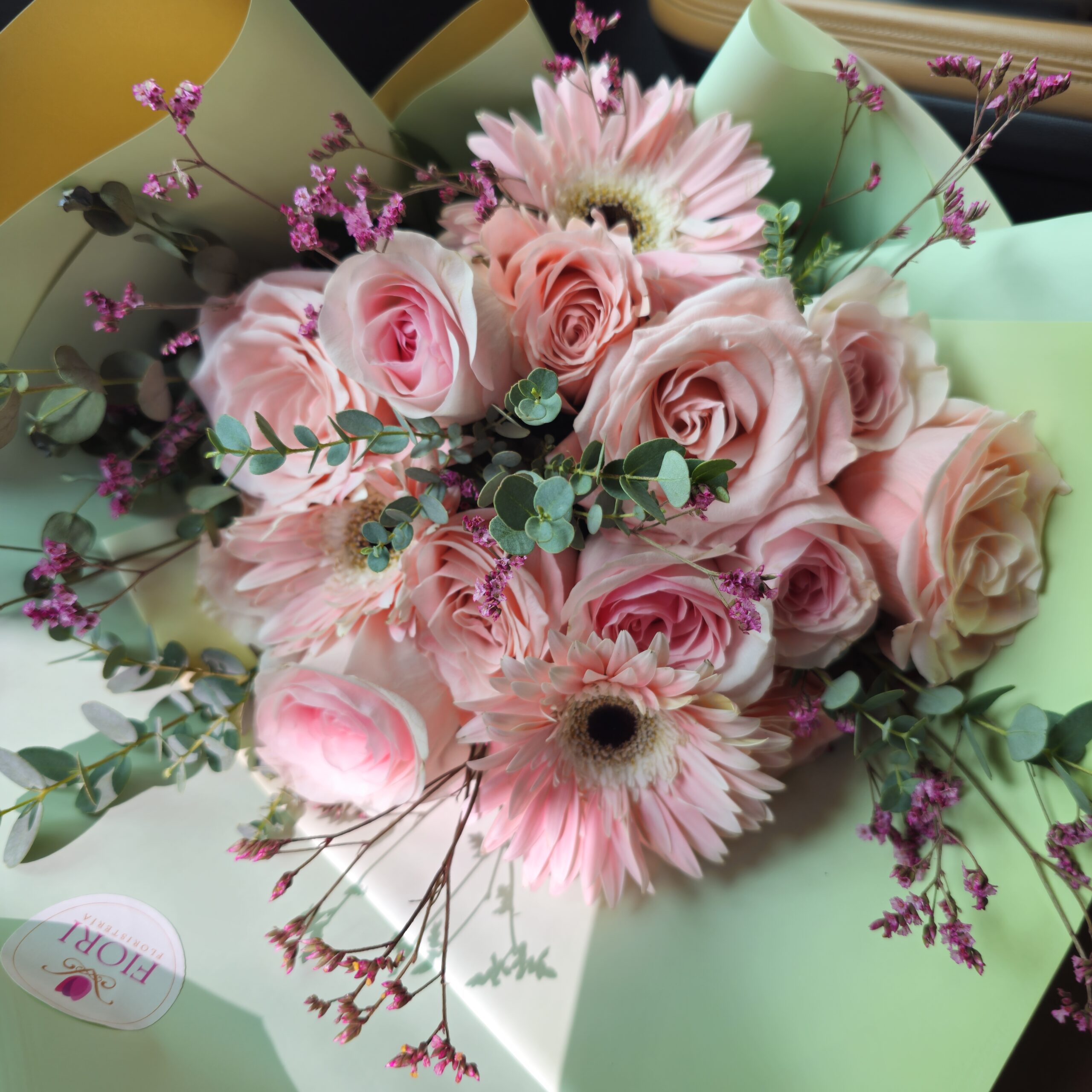 Un bouquet encantador en tonos rosados, compuesto por elegantes rosas y delicadas gerberas, acompañadas de eucalipto y finos acentos florales. Ideal para transmitir amor, agradecimiento o dulces sentimientos.