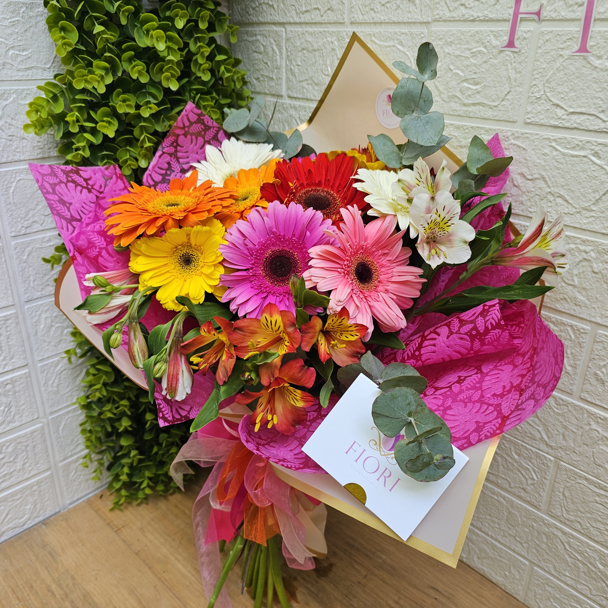 Un estallido de color y alegría en este encantador bouquet, elaborado con 10 vibrantes Gerberas en varios tonos, acompañadas con Alstroemerias y follaje gris, cuidadosamente envueltas en un elegante papel decorativo. Su diseño fresco y lleno de vida lo convierte en el regalo perfecto para iluminar el día de alguien especial, celebrar momentos felices o simplemente decir “hoy pensé en ti”.