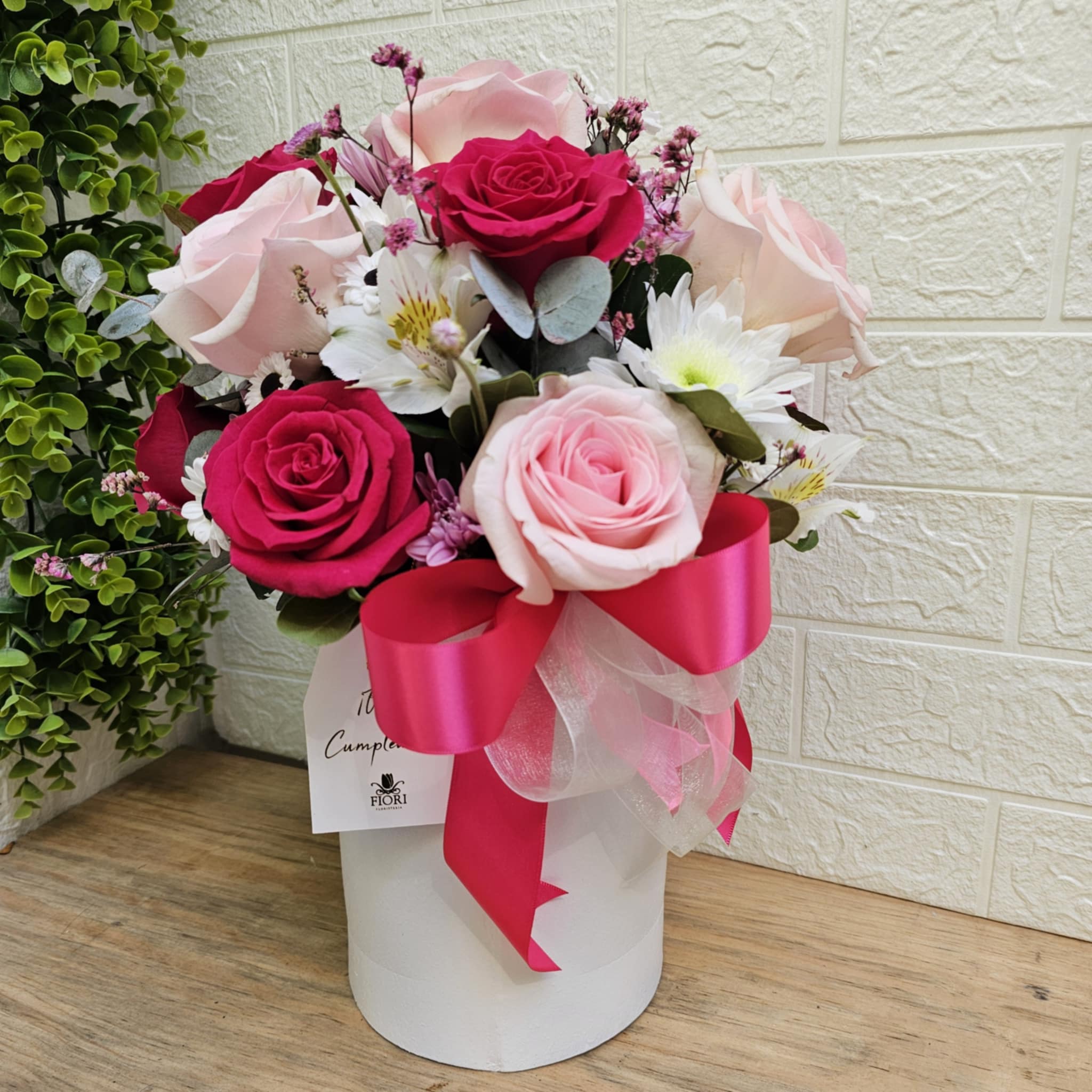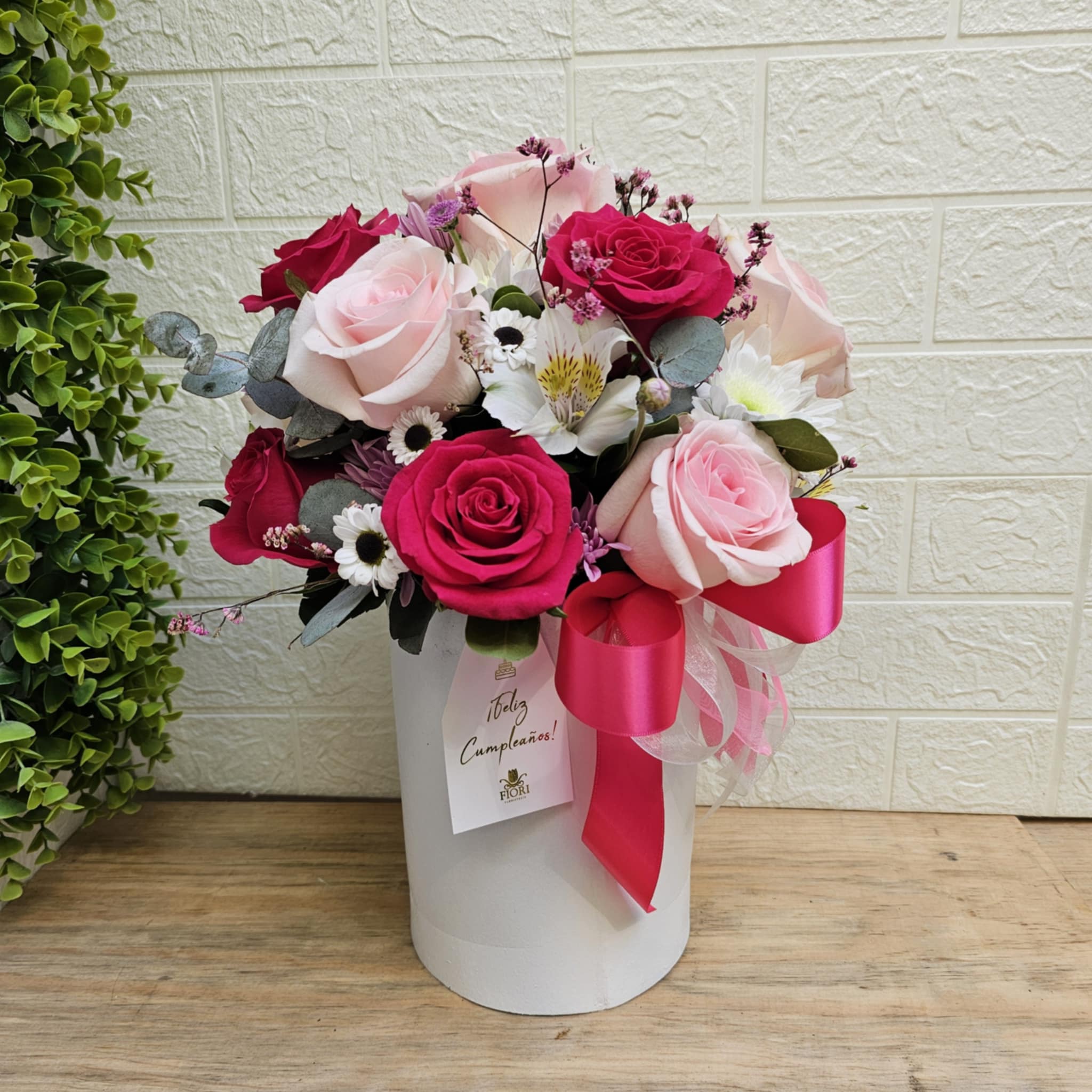 Un delicado arreglo floral diseñado para celebrar la alegría de un día tan especial. Conformado por 12 rosas en tonos rosa pastel y fucsia, acompañadas de margaritas blancas y flores de acento, este diseño combina dulzura y frescura en perfecta armonía. Presentado en una elegante base blanca y adornado con un lazo festivo en tonos rosa, es el regalo ideal para expresar cariño y buenos deseos en un cumpleaños inolvidable.