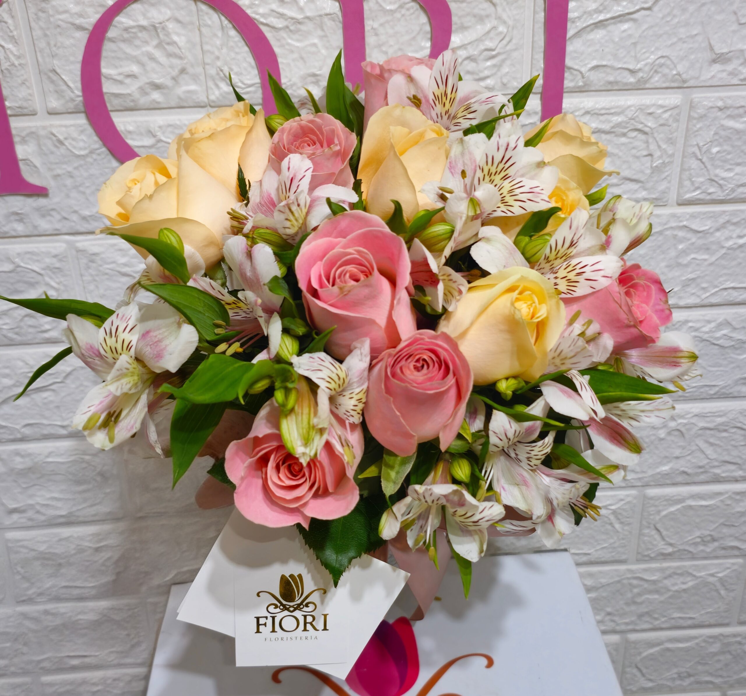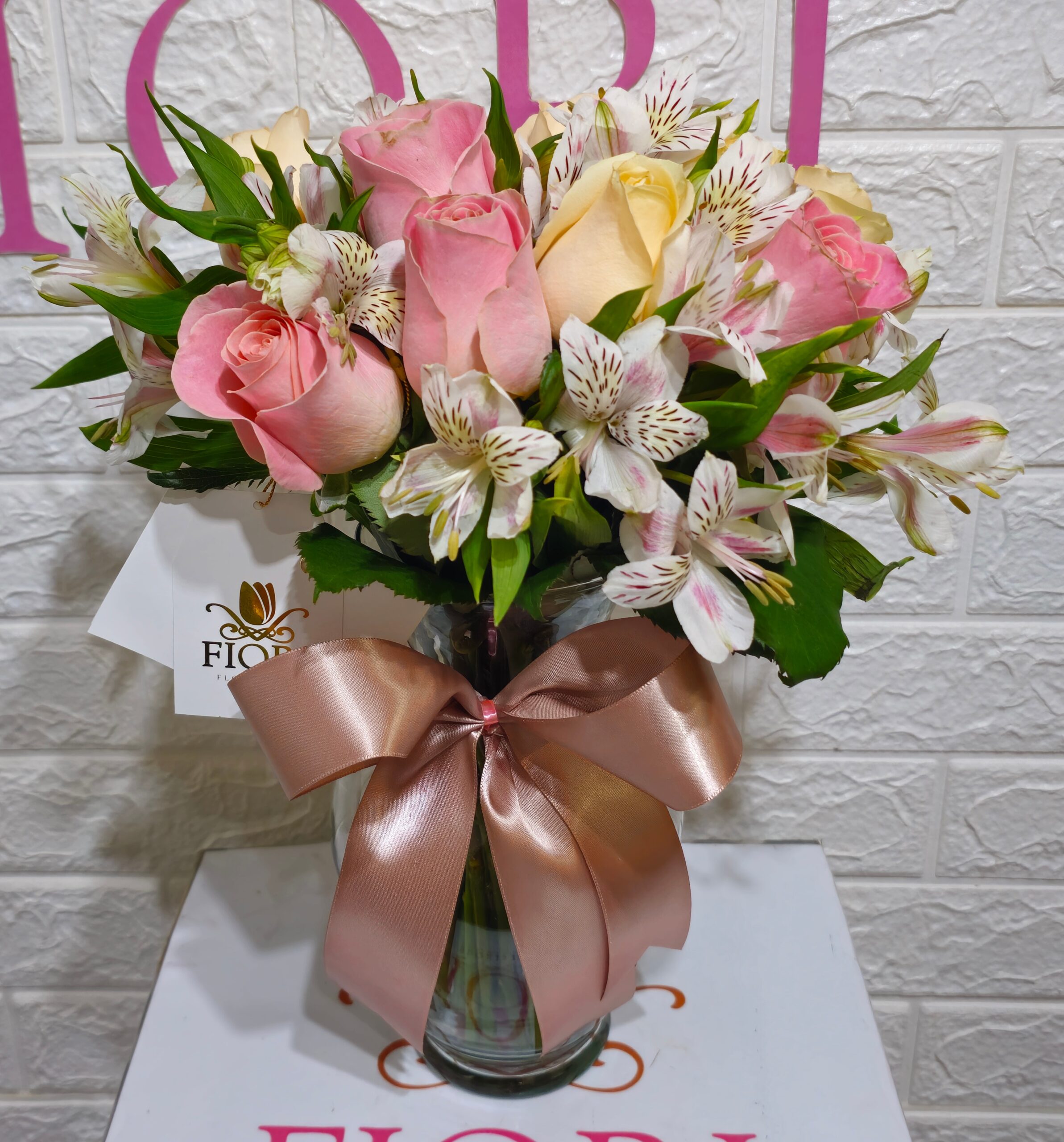 Un delicado arreglo en florero de cristal, compuesto por elegantes rosas en tonos rosa y crema, acompañadas de frescas alstroemerias blancas con toques rosados. Decorado con un lazo satinado en color champagne, este diseño transmite ternura y sofisticación, ideal para regalar en cumpleaños, aniversarios o simplemente para iluminar cualquier espacio con un detalle lleno de encanto.
