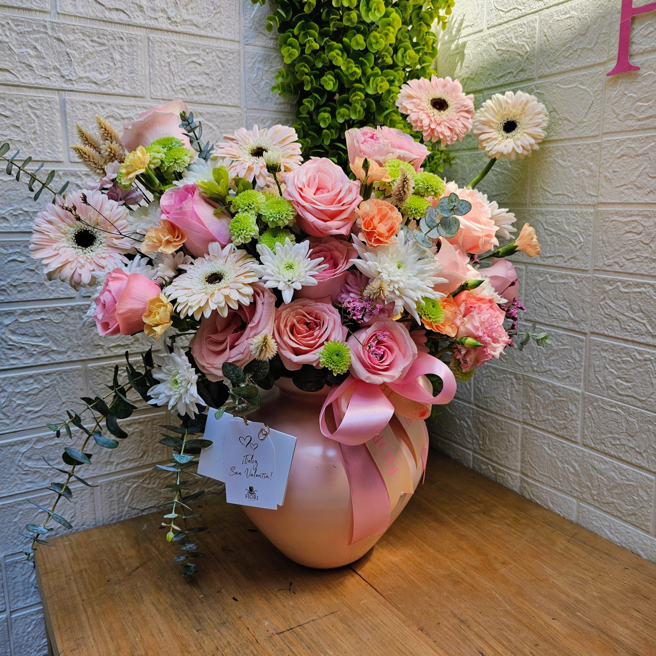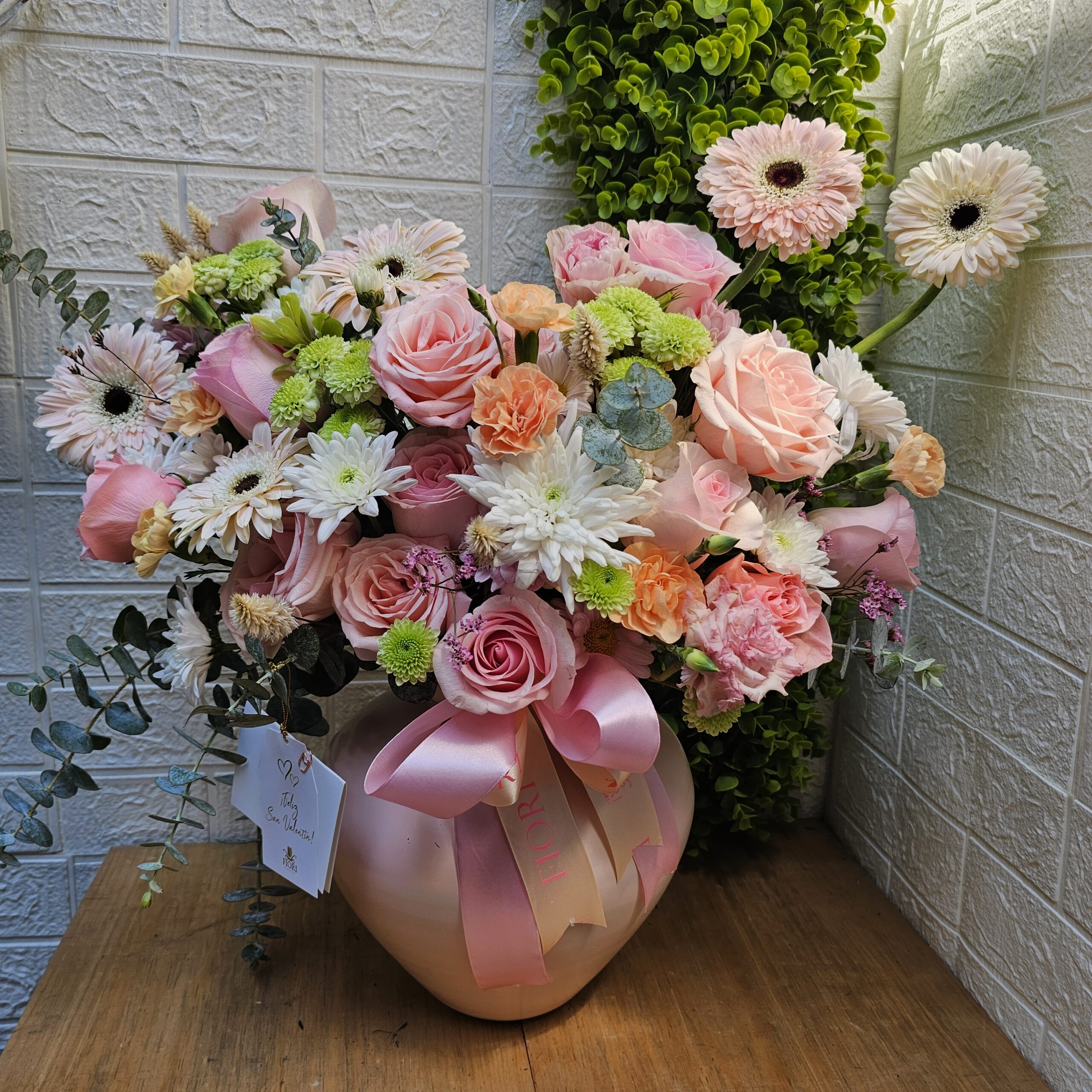 Diseño elegante, compuesto por una delicada selección de flores en tonos rosados y blancos, presentado en un florero de vidrio en tono pastel con moño decorativo. Un diseño que transmite romanticismo, exclusividad y buen gusto. Diseño de una sola vista.