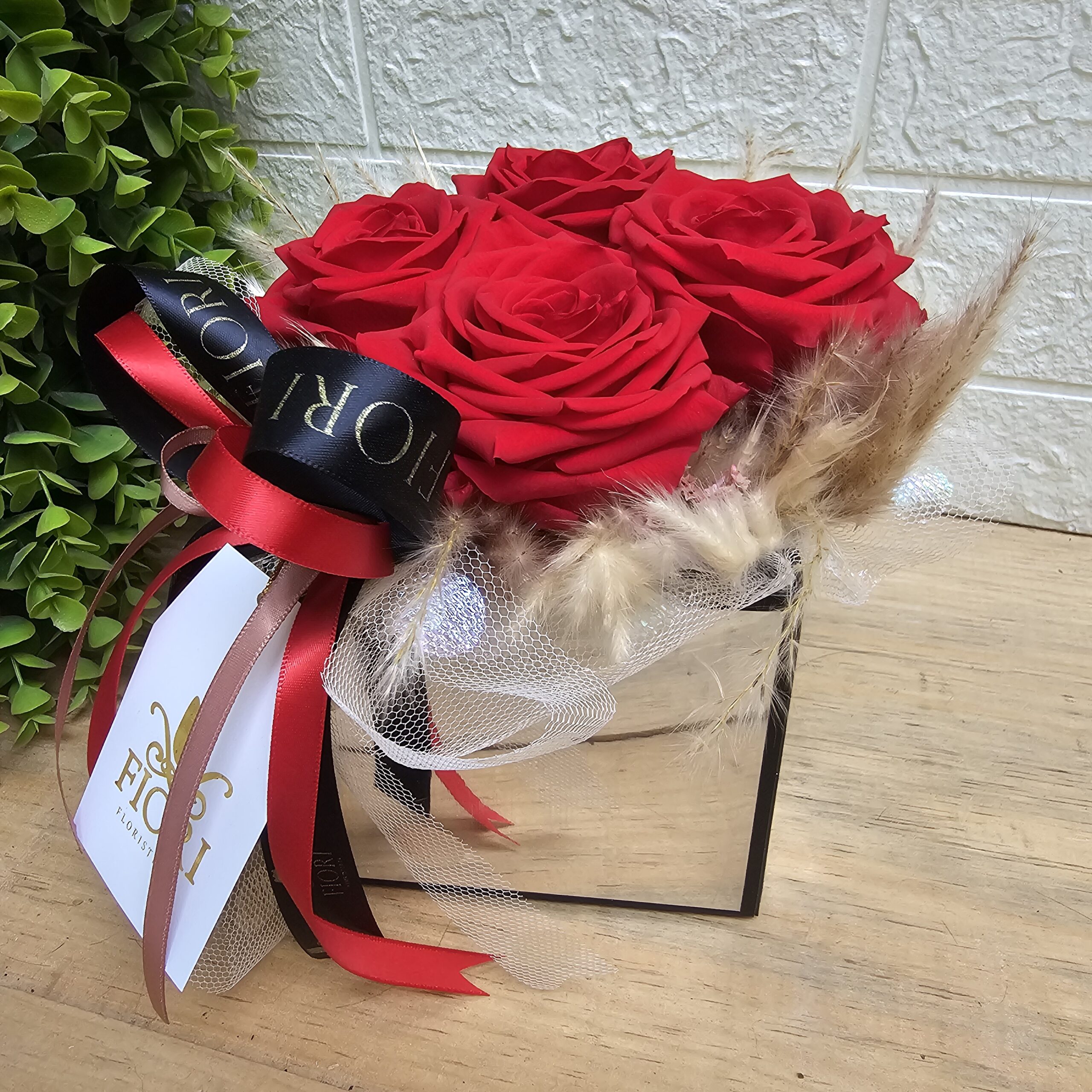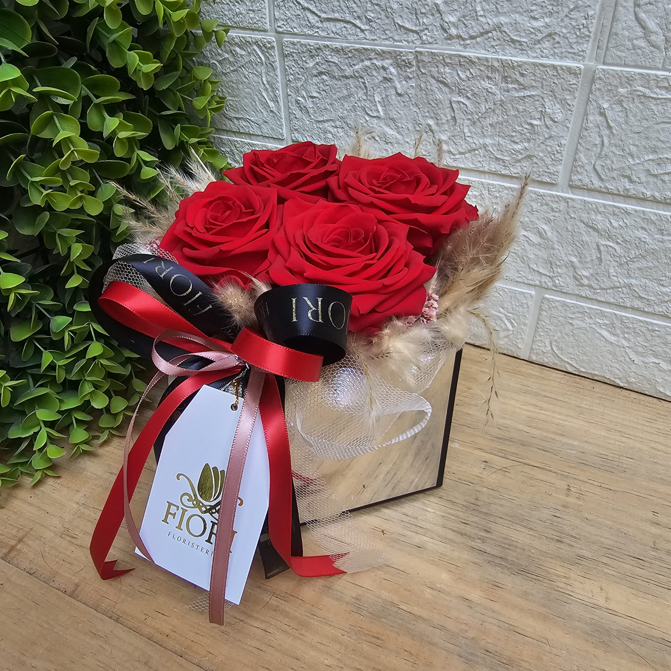Este hermoso arreglo con 4 Rosas eternas naturales calidad premium, combina la elegancia y romanticismo en un diseño moderno, acompañadas con follaje natural preservado, en caja tipo espejo.