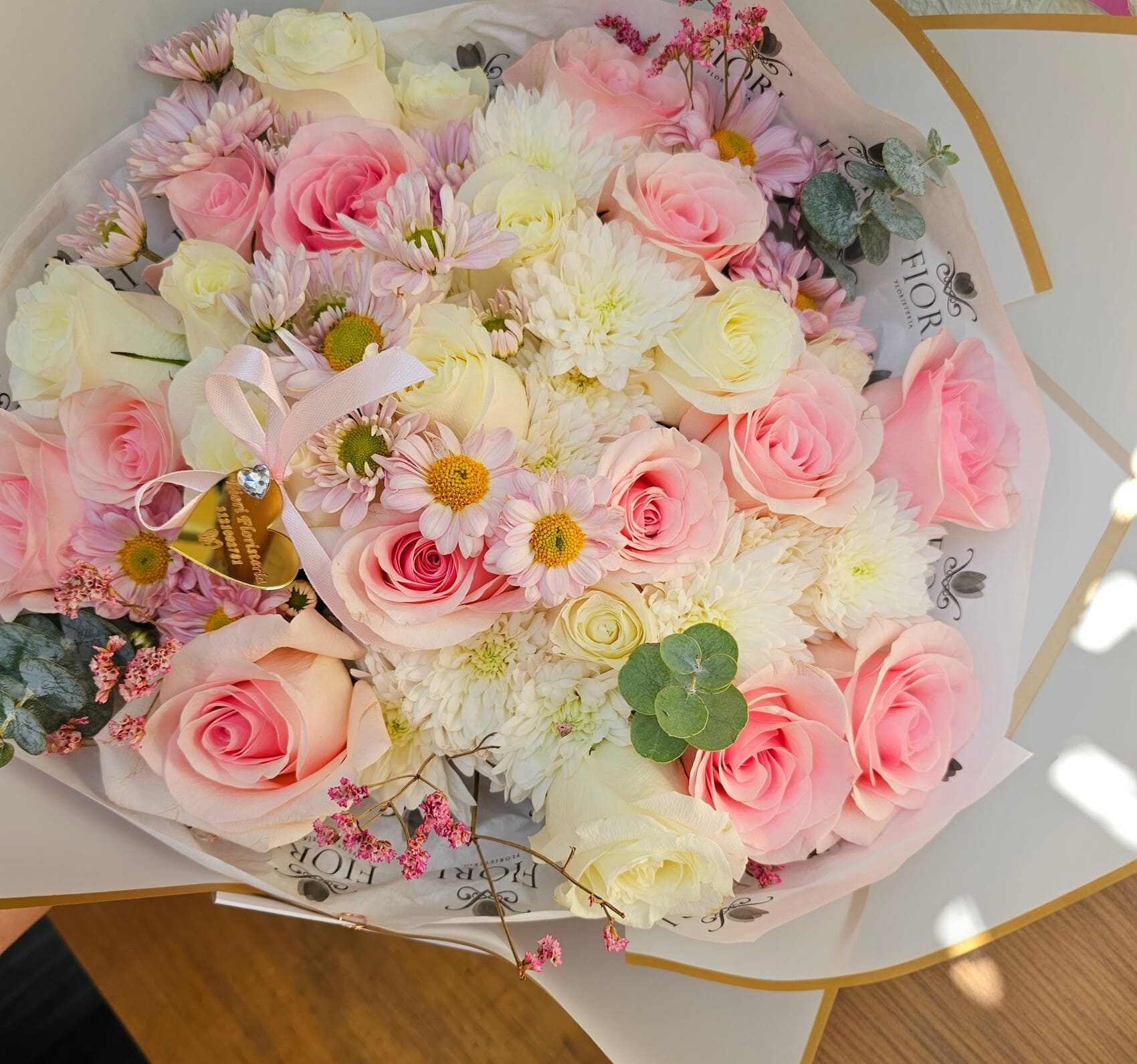 Un abrazo hecho flores. Este Bouquet combina texturas suaves y tonos románticos para crear un detalle de lujo. ¡El regalo que mamá no dejará de presumir! Bouquet con 24 Rosas calidad premium y Margaritas en tonos pastel.