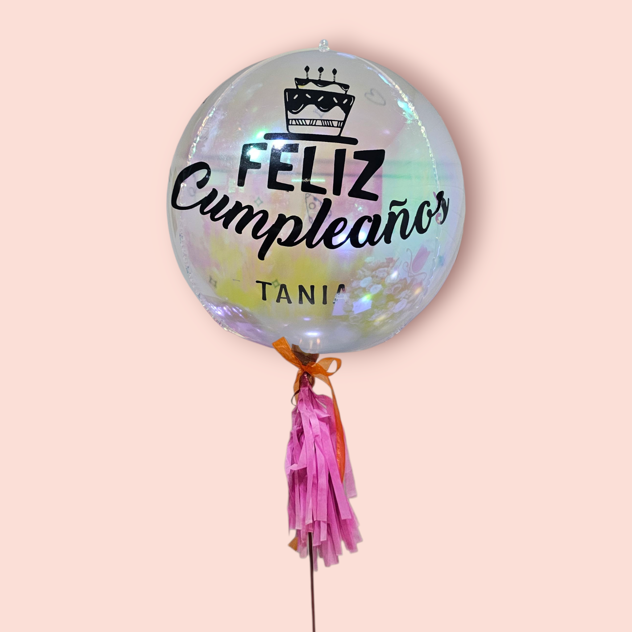 Globo Esfera Iridiscente con gas helio y calcomania de Feliz cumpleaños.
