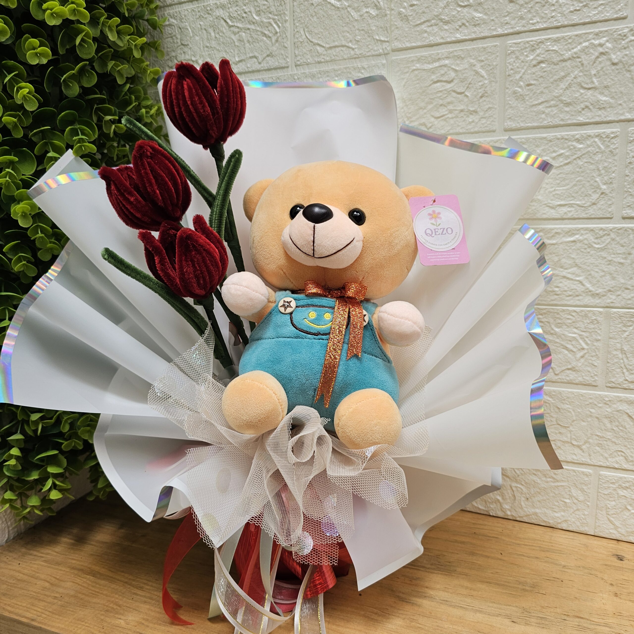 Sorprende con este hermoso arreglo que combina un tierno peluche y flores artesanales, perfectas para regalar en cualquier ocasión especial, cumpleaños, aniversarios, graduación o simplemente para alegrar el día de alguien especial.
